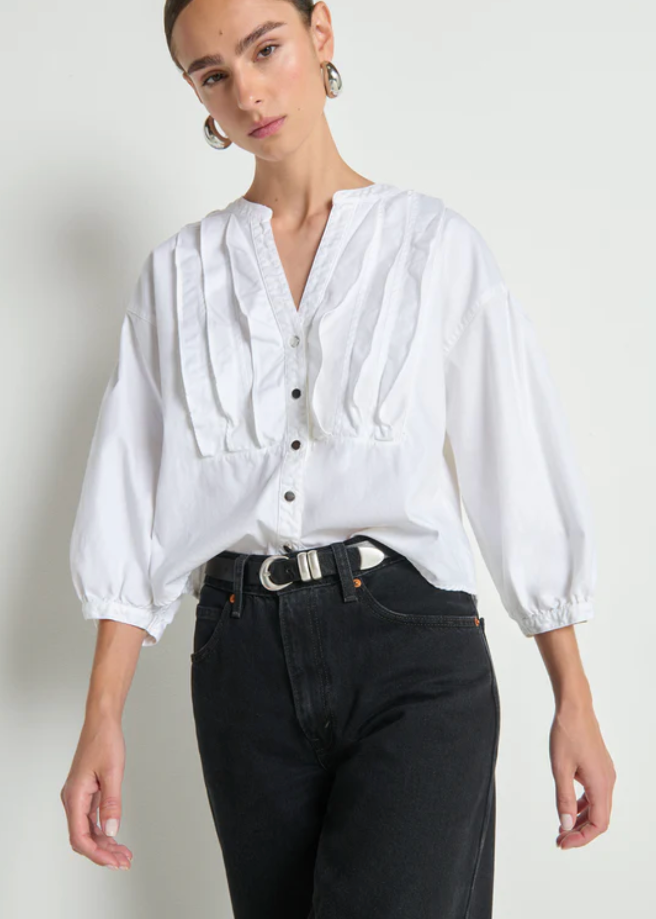 The Amelia Ruffle Shirt brings effortless texture and an element of interest to the everyday. Made of 100% cotton in a boxy, cropped fit.