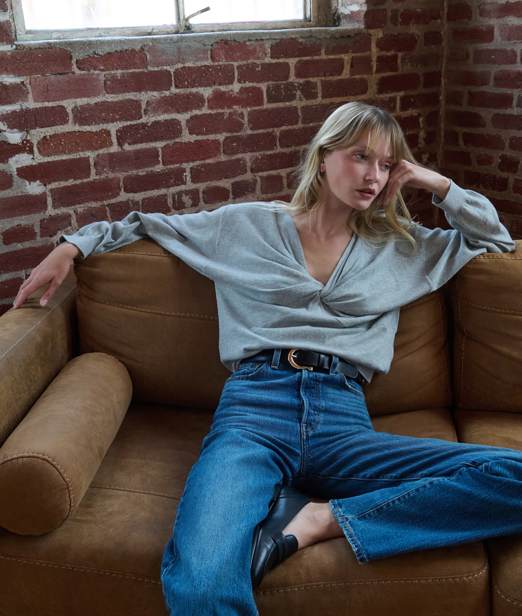 This cashmere cotton blend is a true cozy staple in every collection. Features include a drop shoulder, ribbing at the sleeves and waist for structure, and a gathered, knotted neckline. This one comes in Heather Grey.
