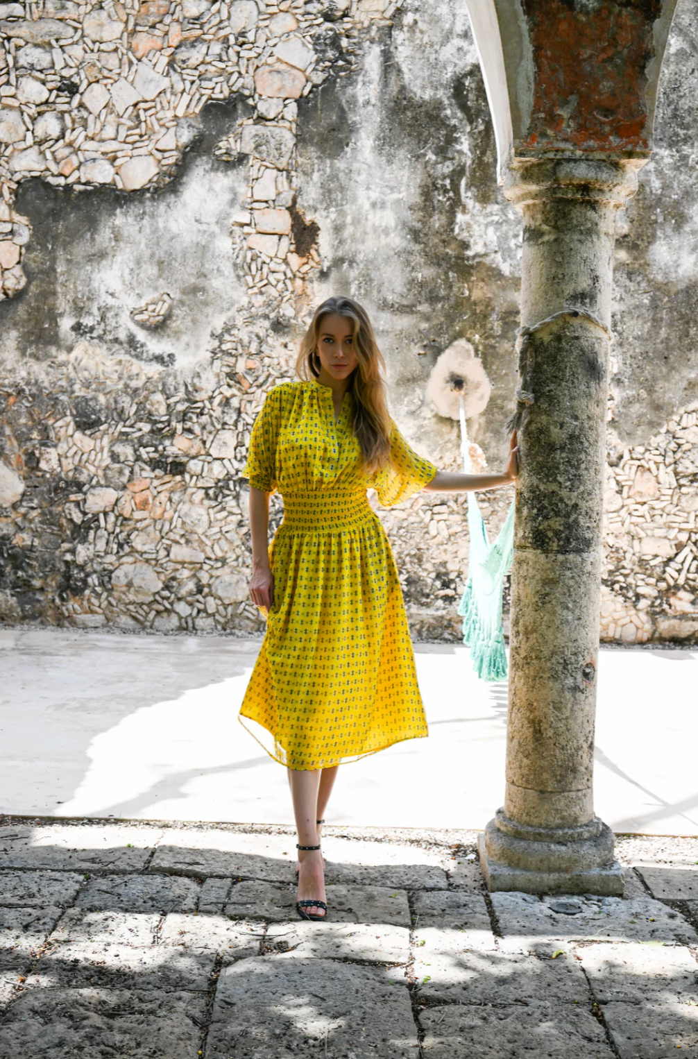 Bright, breezy, and effortlessly feminine, this sunny floral midi dress is made to stand out. Designed in a vibrant yellow hue with a delicate allover print, it brings warmth and charm to any wardrobe. The lightweight, flowy fabric moves beautifully, while the gathered waist creates a flattering, defined silhouette.