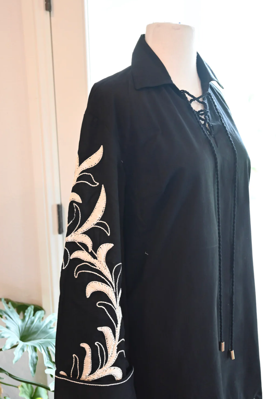 Elevate your wardrobe with this chic black tunic dress, designed for effortless style and all-day comfort. Crafted from a soft, breathable fabric, this dress stands out with its beautifully embroidered sleeves featuring flowing white botanical motifs that add a touch of sophistication and artistry.