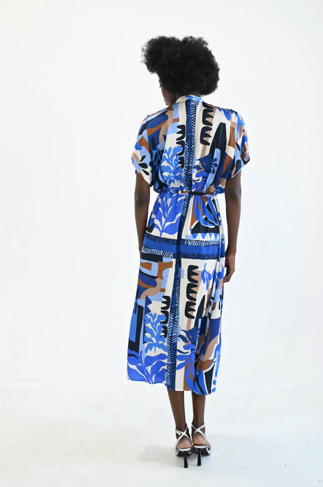 Make a bold, effortless statement in this vibrant abstract print midi dress. Designed with a fluid, lightweight fabric, it features a relaxed silhouette that drapes beautifully with every step. The button-front detail adds versatility, while the adjustable drawstring waist creates a flattering, customizable fit. Short sleeves and a breezy skirt offer easy movement and all-day comfort.