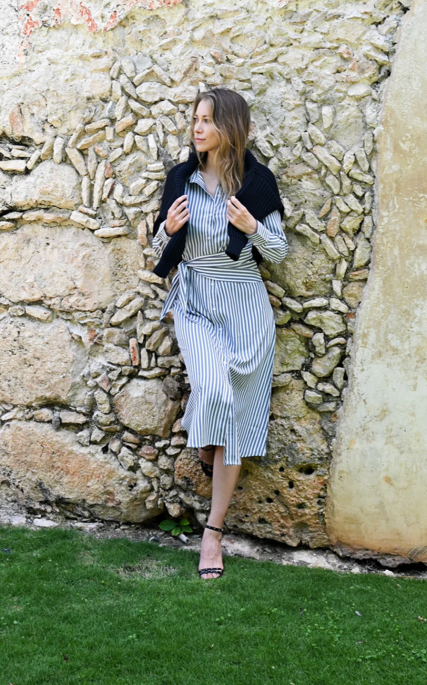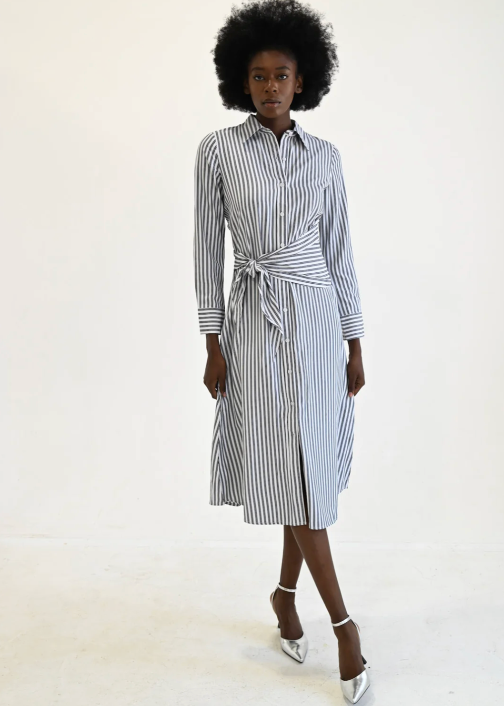 Sophisticated and modern, this striped shirt dress brings effortless elegance to any wardrobe. Designed with classic vertical stripes, it creates a clean, elongating silhouette while offering a fresh twist with its wrap-style waist tie. The tie detail cinches the waist for a flattering, customized fit that enhances the dress’s tailored shape.