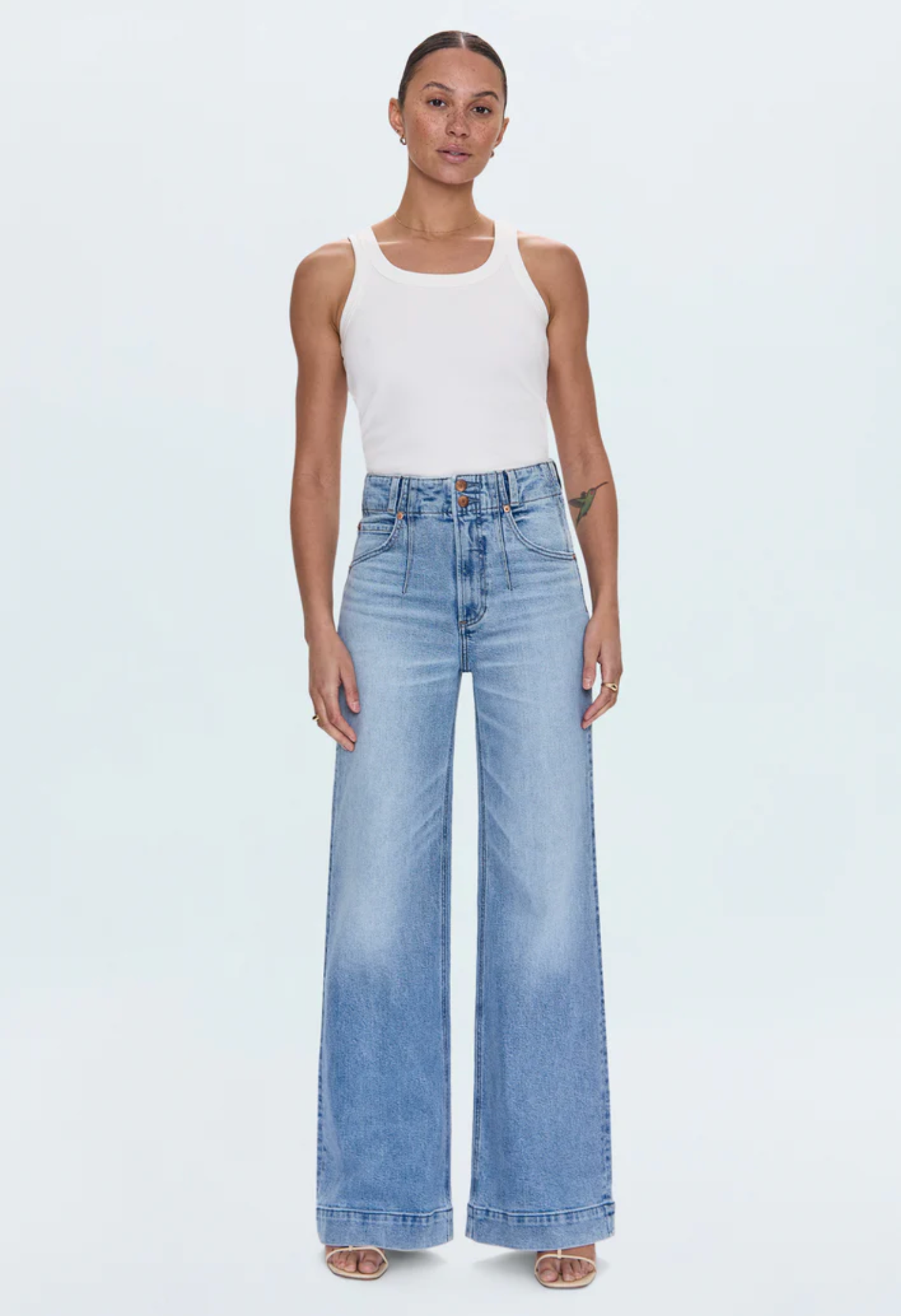 The ultra wide leg with a twist. Lana delivers commanding presence with a high rise and ultra wide leg silhouette, finished with a full-length 33" inseam. The double button closure adds modern detail while the ultra wide opening brings contemporary proportions to any look. Crafted from our comfort stretch denim that provides structured shape with the perfect amount of movement. Terrace brings effortless sophistication with its light wash and subtle fading that feels authentically lived-in.