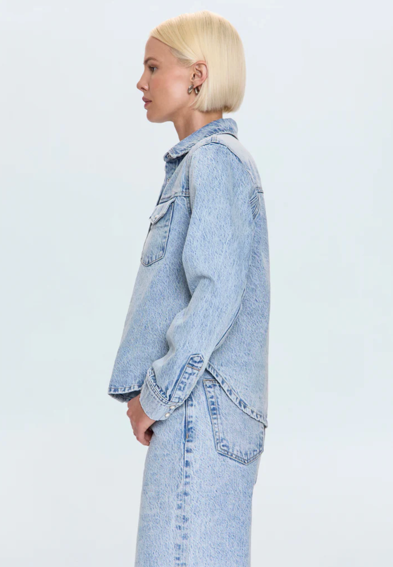 Tailored and timeless, Thea refines the denim shirt with a shrunken, modern silhouette that flatters without feeling fitted. Classic details—button front, pointed collar, and chest pocket—ground it in tradition, while the proportions make it ideal for layering under jackets or over tanks. Crafted from 100% cotton non-stretch denim in Modena Vintage, a sun-faded light blue wash that channels authentic, lived-in character.