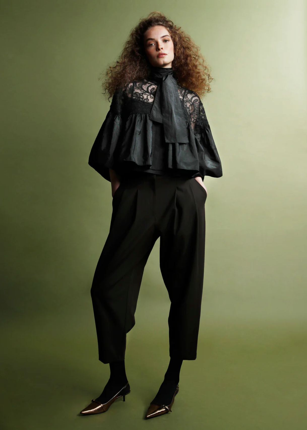 Discover the vintage pleated taffeta and lace poncho , a garment that redefines style with a unique fusion of textures and volume. The delicate lace top with a stand-up collar lends a romantic and sophisticated air, while the voluminous pleated taffeta bottom adds movement and a powerful visual impact.