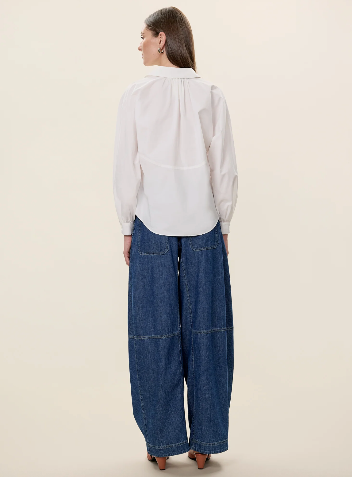 A crisp cotton poplin blouse designed with soft structure and refined ease. The open neckline is framed by a gently curved collar, bringing a subtle femininity to the clean silhouette. Full sleeves with pleated volume and tailored cuffs add quiet detail. Available in white and chambray, it’s an easy staple that pairs well with denim, trousers, or layered under a jacket.