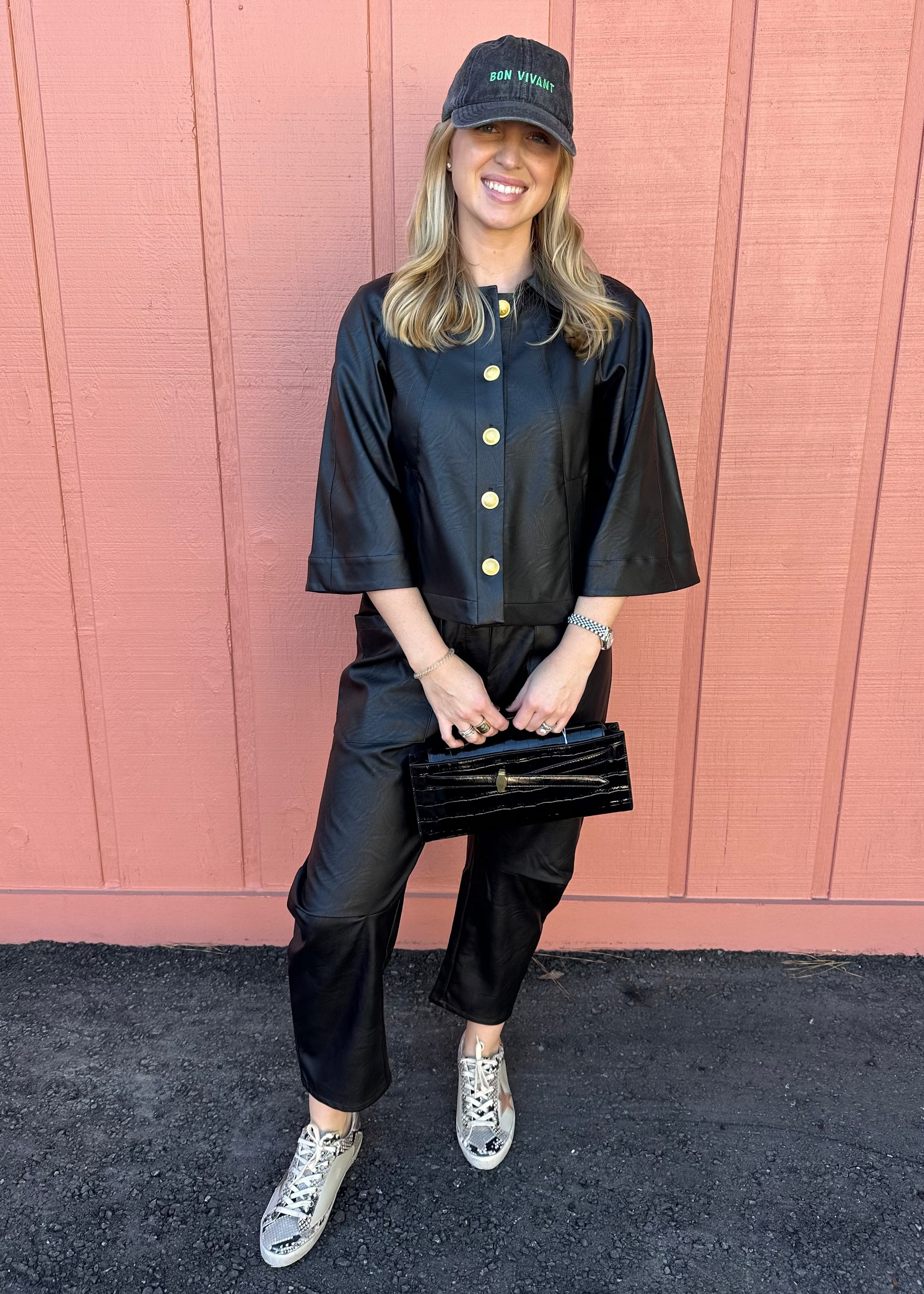 The Annie Jacket combines contemporary style with practical sophistication. Crafted from supple faux leather, this piece delivers a polished aesthetic. Elegant gold buttons provide refined detailing, while the three-quarter sleeve length offers versatile layering options for transitional seasons. A wardrobe essential that transitions seamlessly from professional settings to casual occasions.