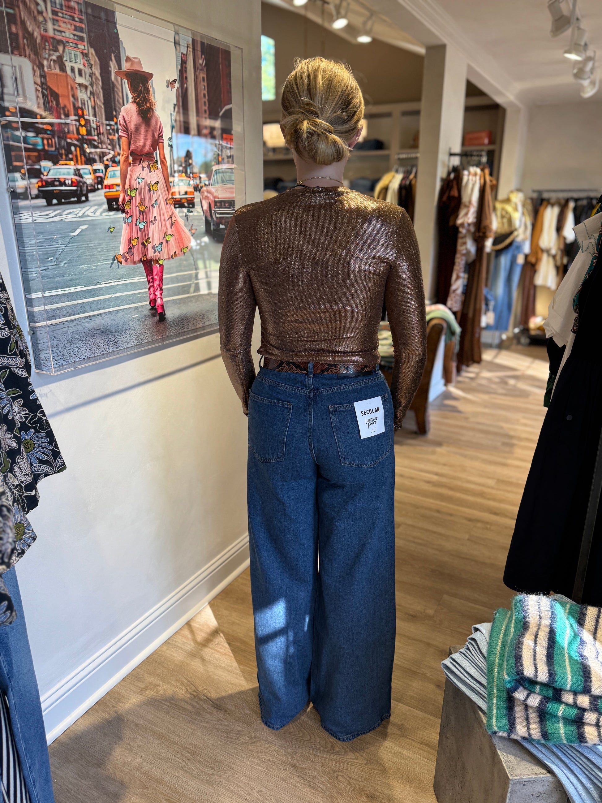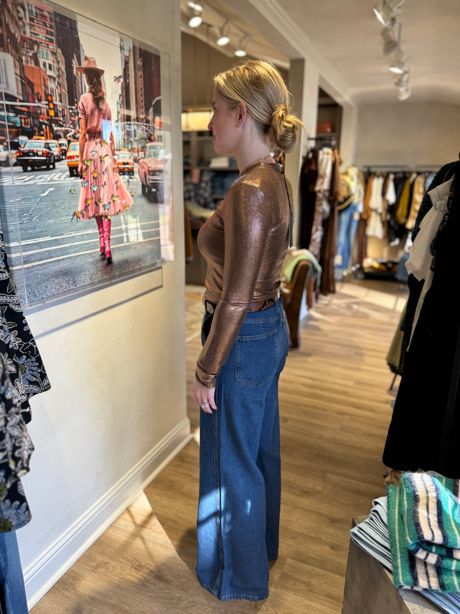 The Flora top is a striking addition to your wardrobe, made from shimmering Italian “disco” jersey. With its fitted crew-neck silhouette and metallic finish, this top is perfect for a bold, fun look. Pair it with matching pieces for a statement-making outfit.