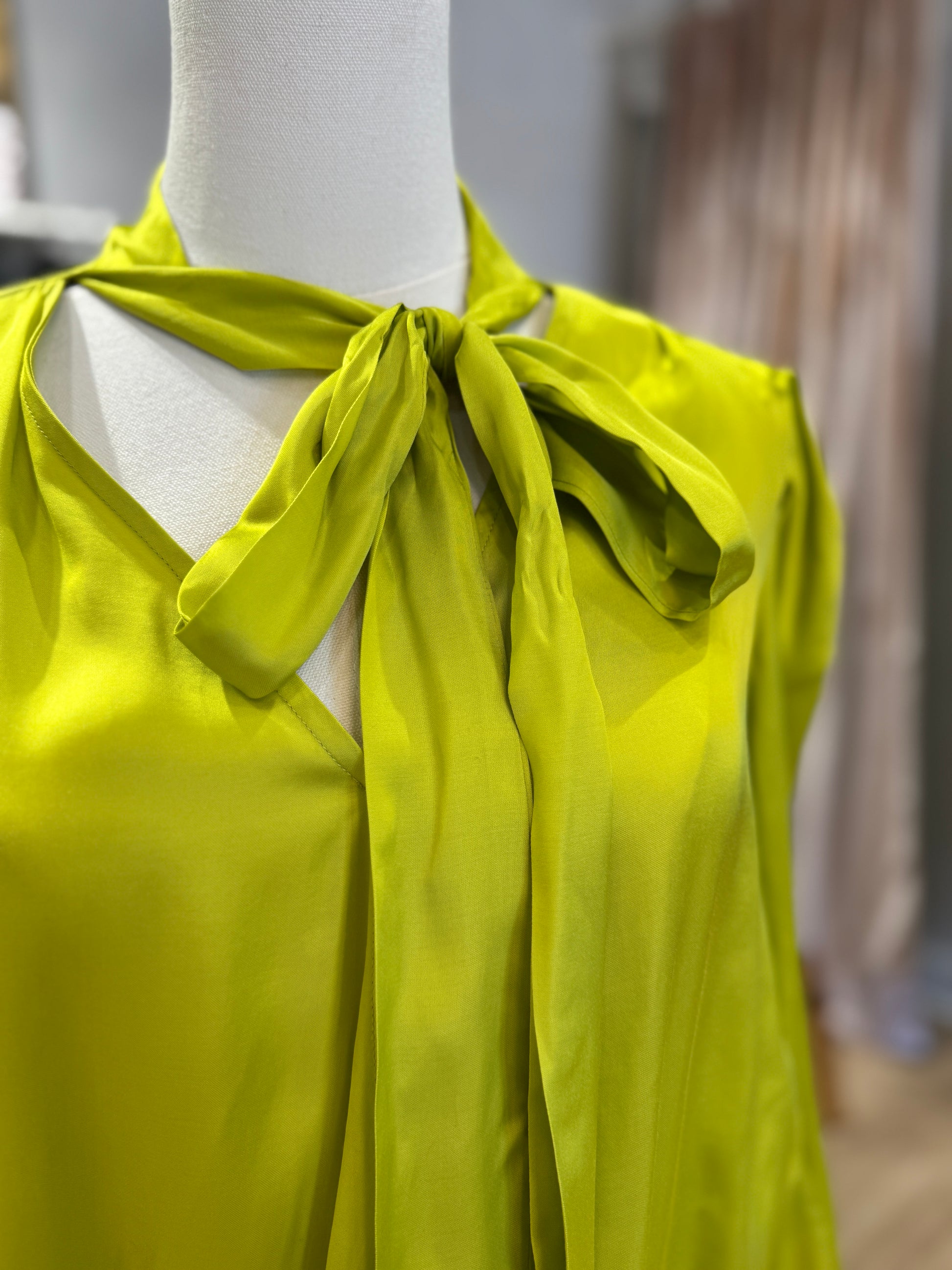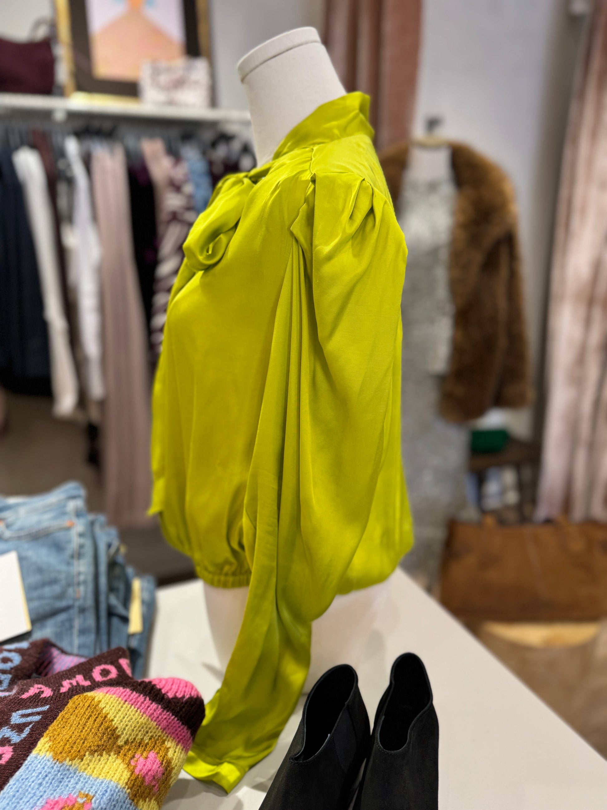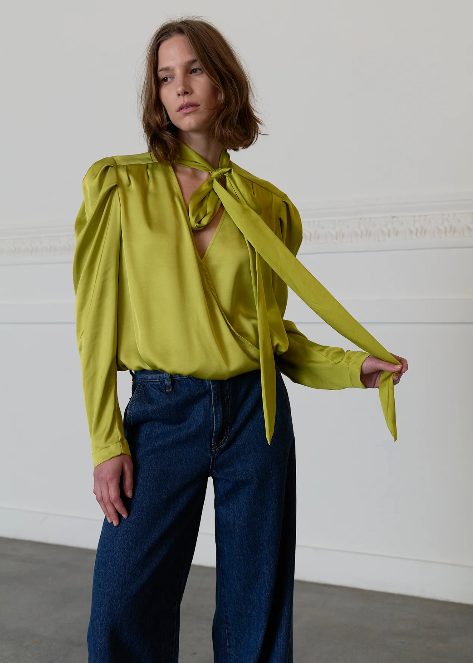 The Helena Shirt combines refined tailoring with contemporary silhouette. A wrap-style bodice creates a flattering fit, while the tie bow at the neckline adds an elegant focal point. Gathered shoulders provide subtle volume and movement, softening the overall structure. This versatile piece transitions seamlessly from professional settings to elevated casual occasions, offering both comfort and polished sophistication.