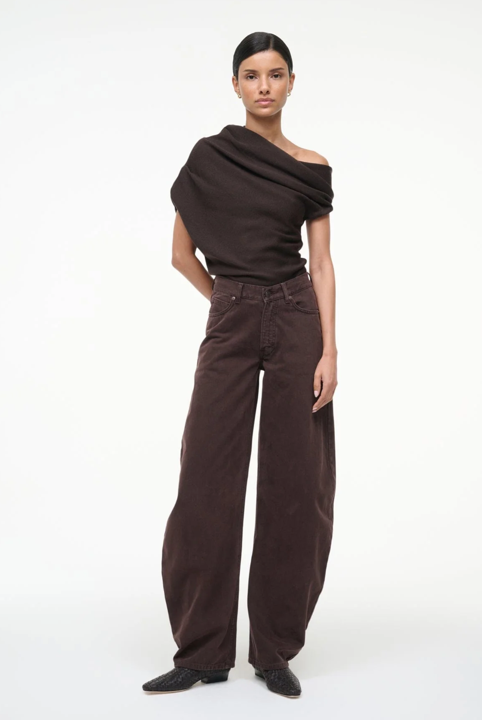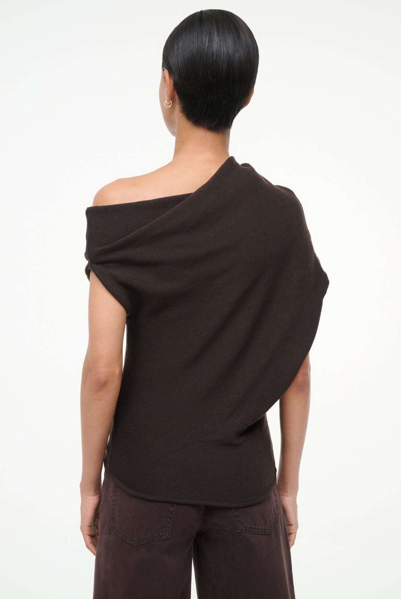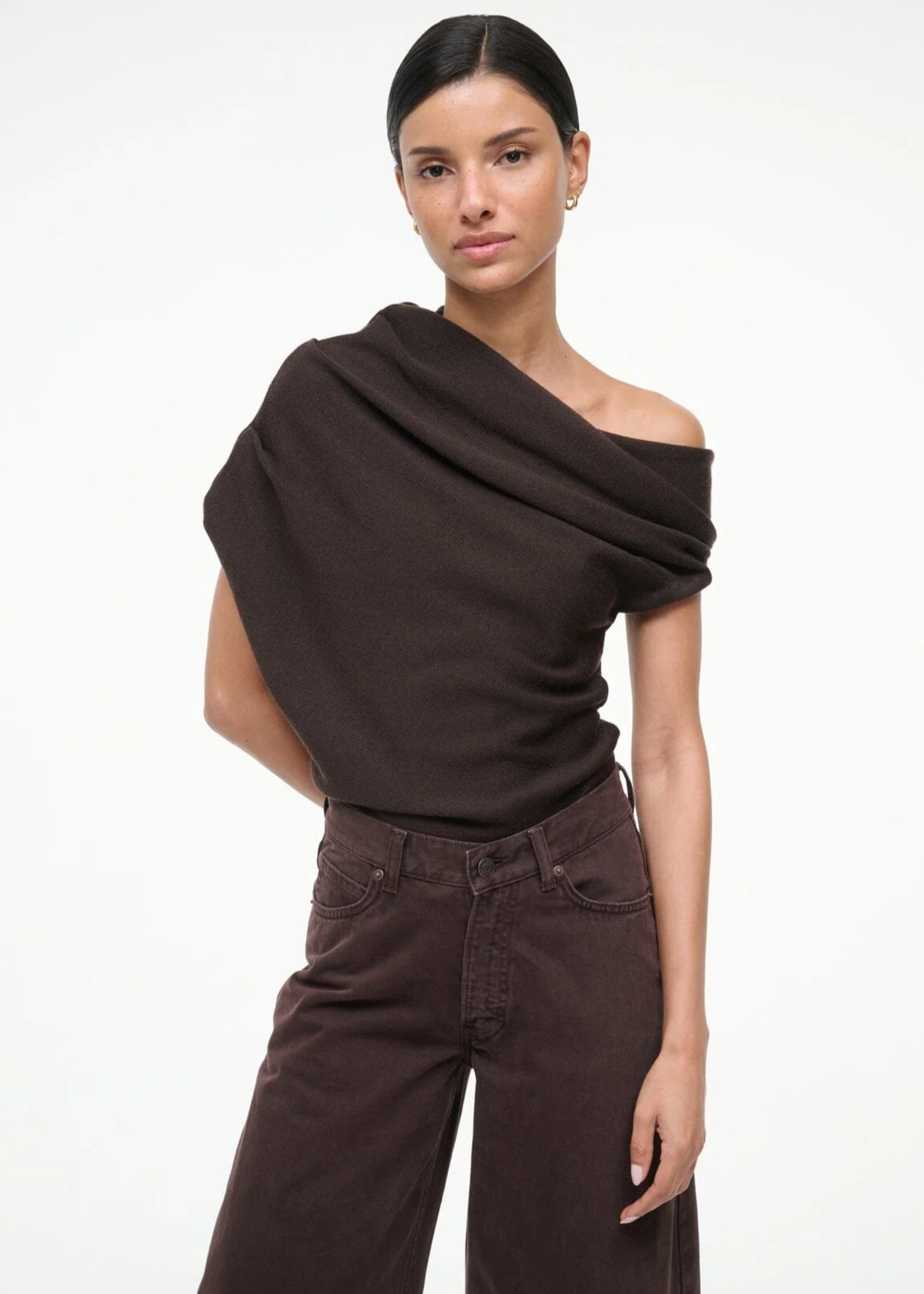 The Mabel Sweater is an asymmetrical draped knit top, featuring a single off-the-shoulder look.