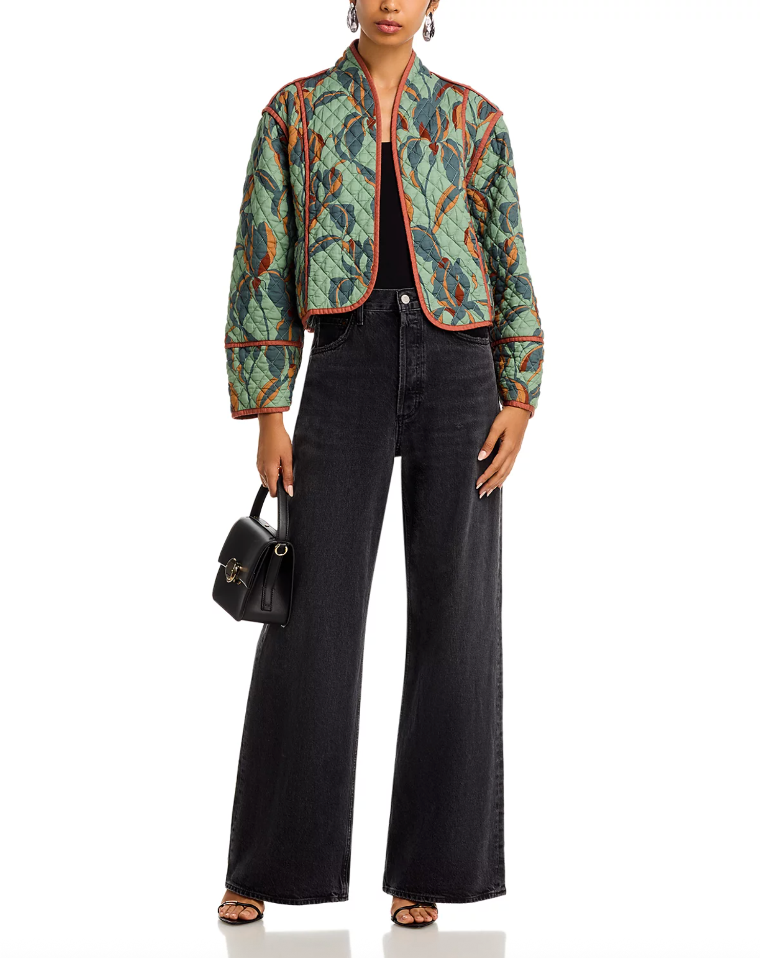 Contrast trim highlights the diamond quilting on this open-front jacket covered in an abstract pattern that welcomes the new season.
