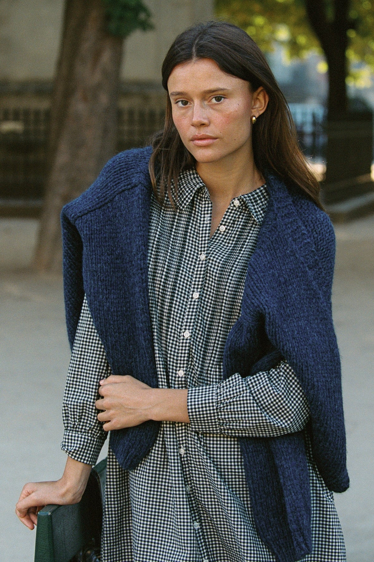 The Olive Dress has piping and pintuck detailing on the front bib, antique white buttons down the front, and a complementary ruffled-bib collar. This dress features our signature hidden side seam pockets for added functionality. Shown here in Onyx Check and made from our cotton.