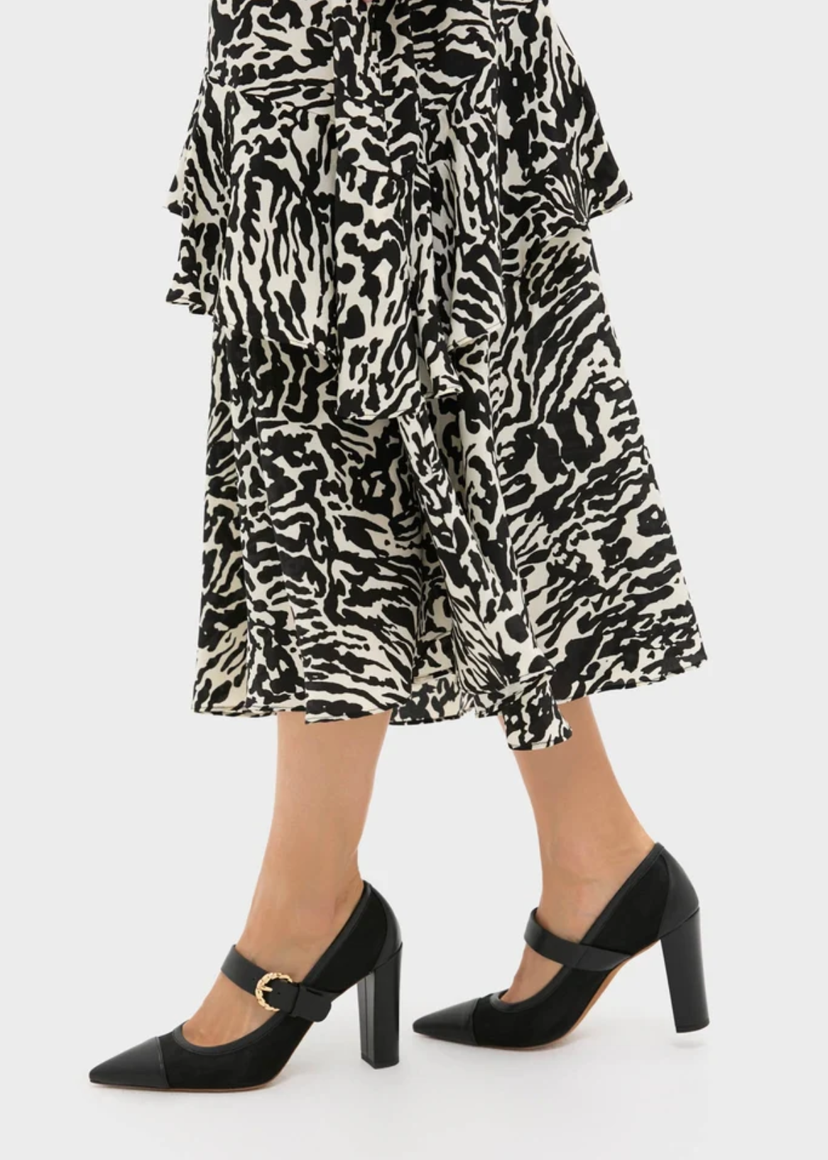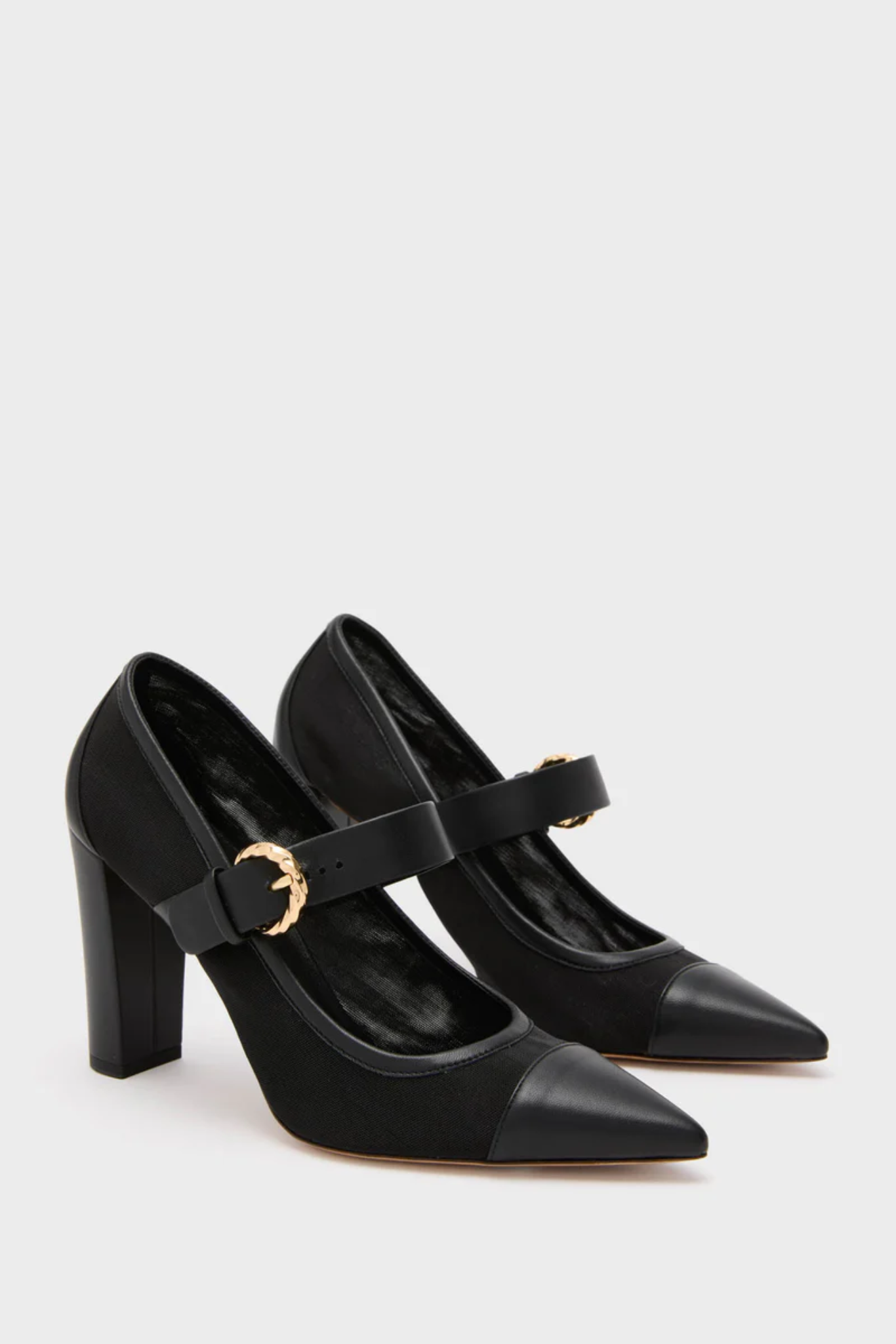 Arriving in forever classic black, this elevated pump is beautifully made in Italy with a mesh upper and a pointed toe in napa leather. It rests on a comfortable block heel and is finished with Ulla Johnson's signature twisted buckle in lustrous antique brass. Style with LBDs, vibrant maxis, or satin skirts this season.