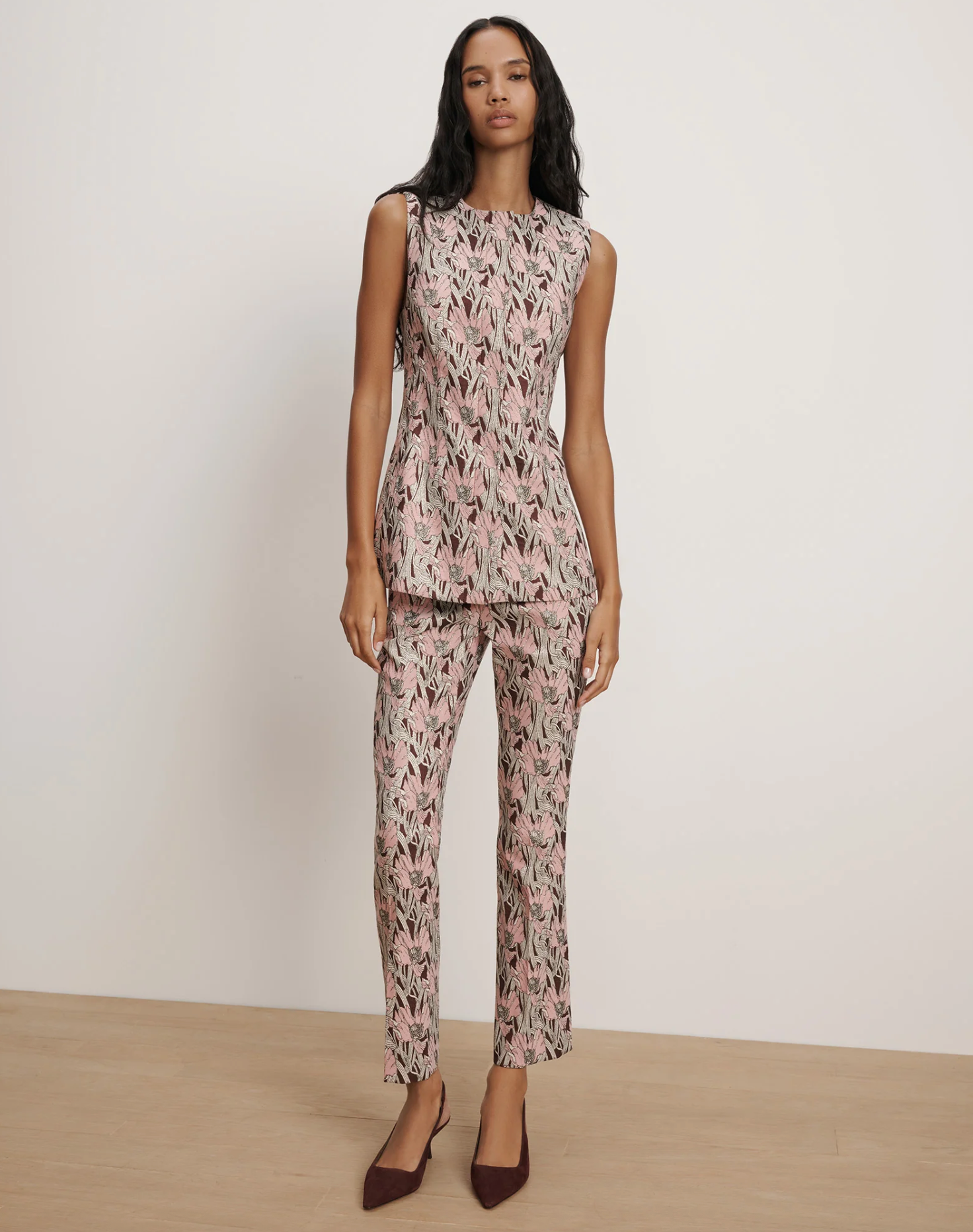 A VB favorite, reimagined in burgundy and pink florals. The Arte pants are cropped and high-waisted with a slim fit and slight flare. Flat welt pockets and a hidden hook-and-bar closure create a sleek, tailored look, while metallic gold threads add a subtle sheen for an elevated finish. Perfect for everyday polish, style it with the coordinating Jessup vest for a matching set or with a cashmere tank top for something more relaxed.