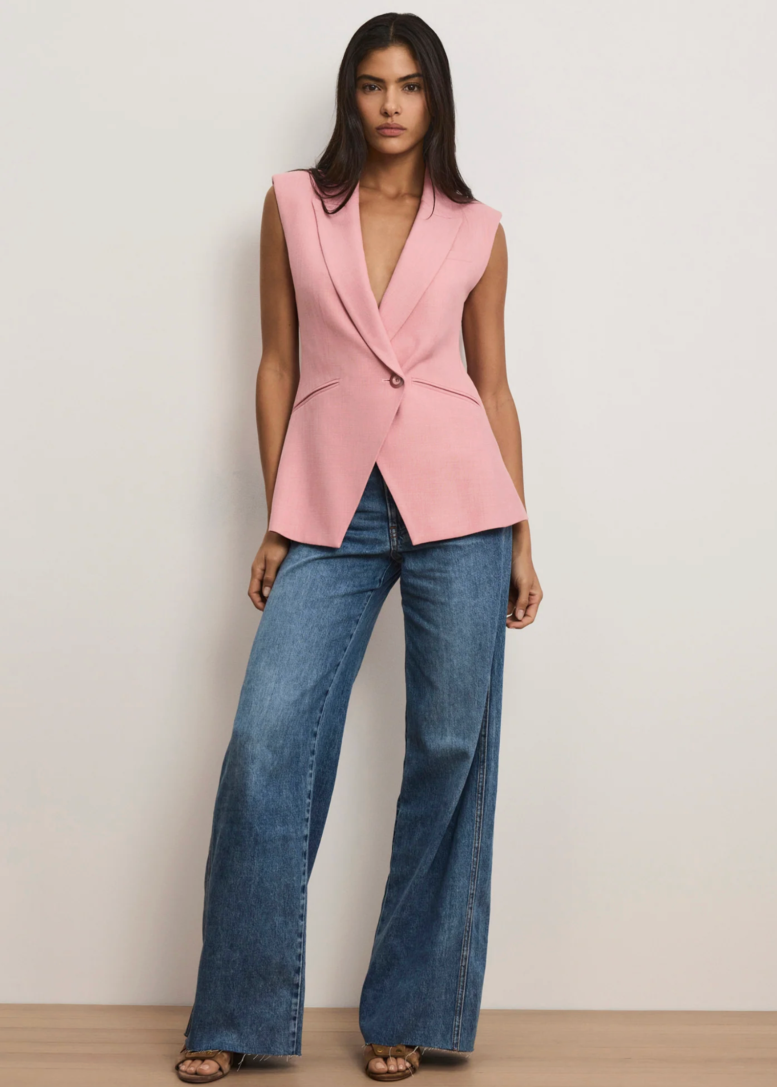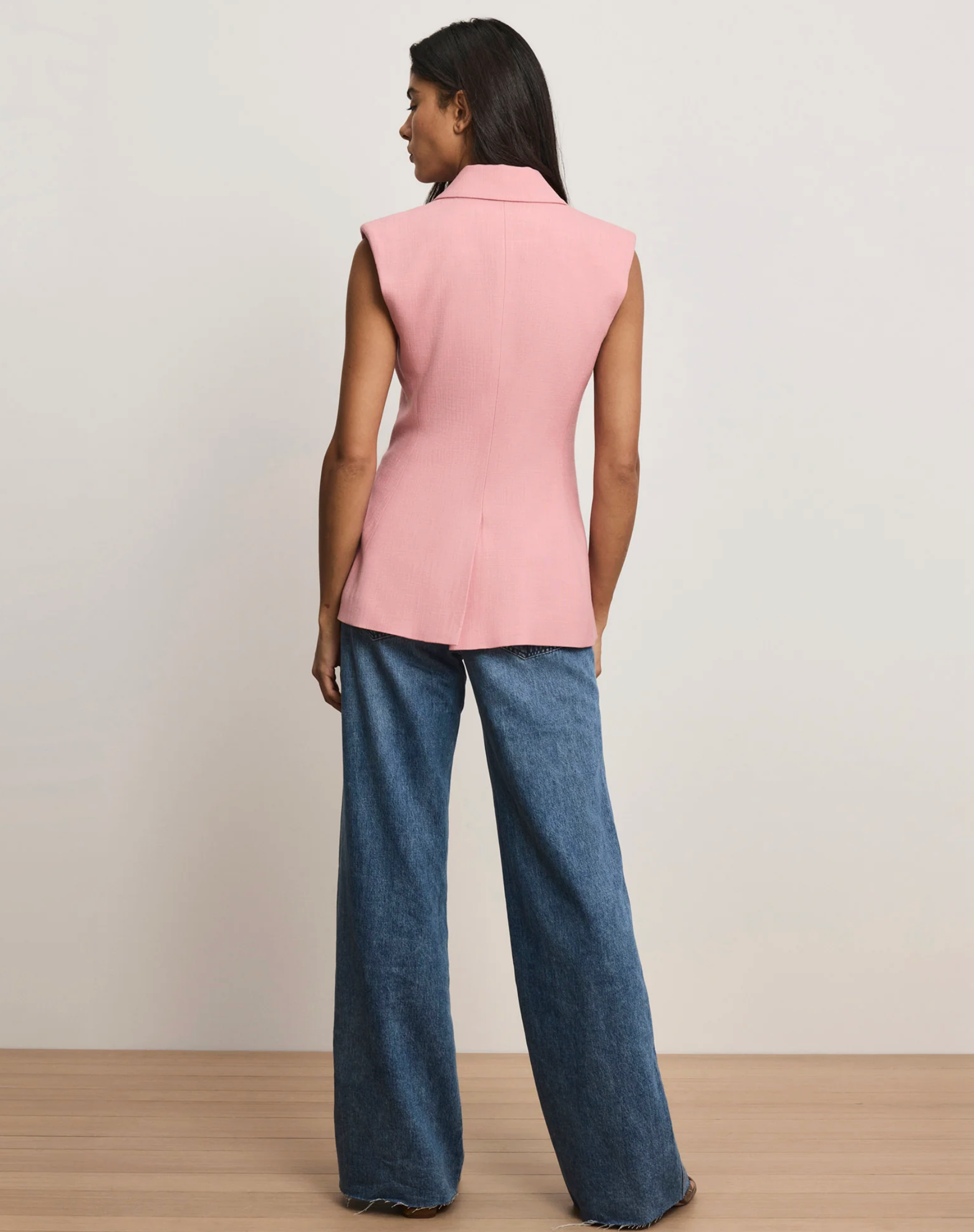 Expertly tailored from a premium stretch blend, the pink Ciel vest is a sleeveless version of a single-breasted blazer. It features thoughtful darting to cinch in the waist, along with clean seaming, angled welt pockets and a sharp lapel for a streamlined silhouette. Finished with a slub texture and the slightest sheen, it's a true wardrobe essential.