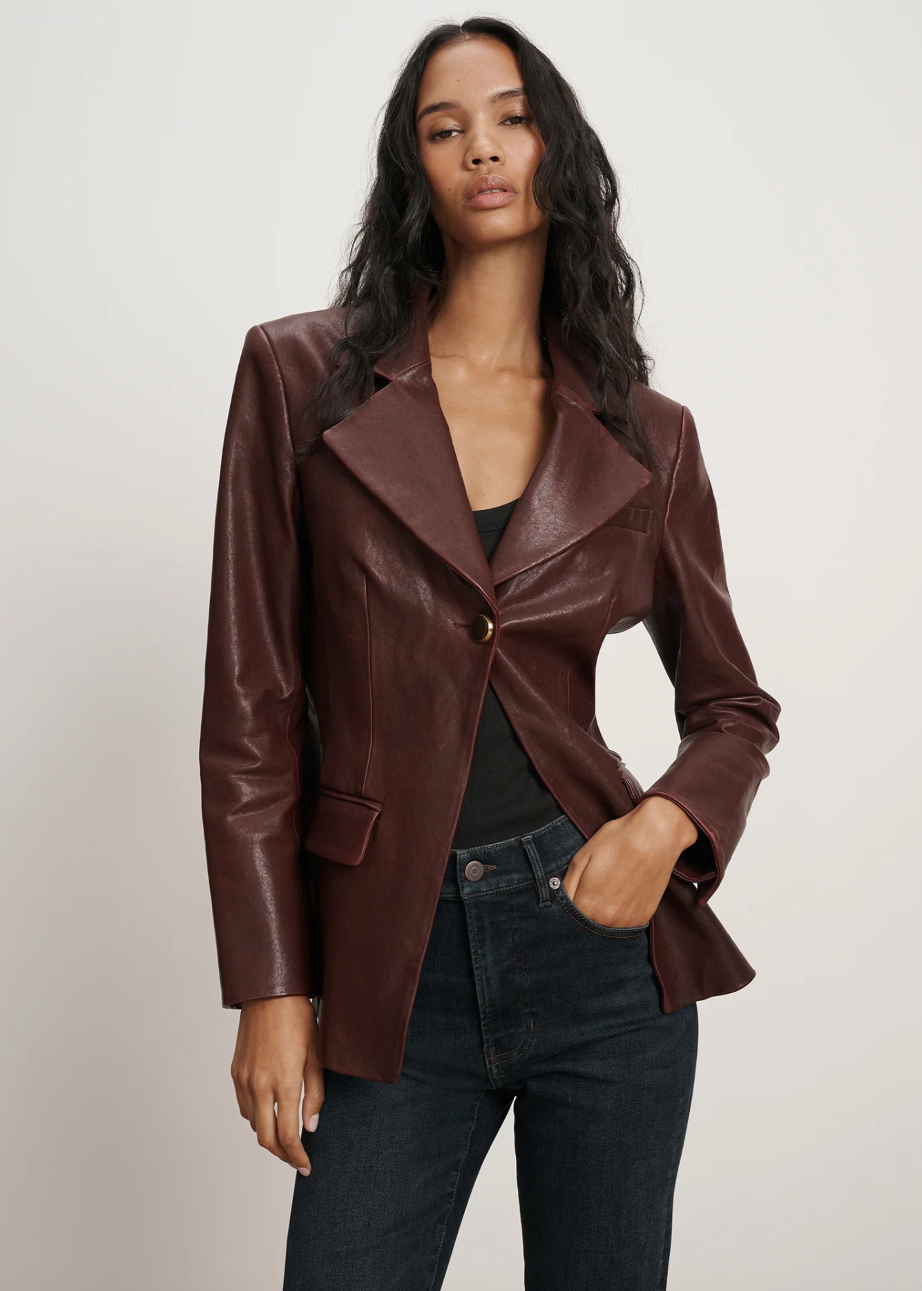 The leather blazer, perfected. Crafted from buttery-soft, lightweight lambskin, the Kessler is expertly tailored for a slim, flattering fit. Side darting and thoughtfully placed flap pockets enhance the shape, while an exaggerated notch lapel adds a subtle vintage touch. Two-tone buttons at the single-breasted front and cuffs complete the look. Pair with trousers for office polish or jeans for something more laid back—then add your favorite dickey to switch up your look.