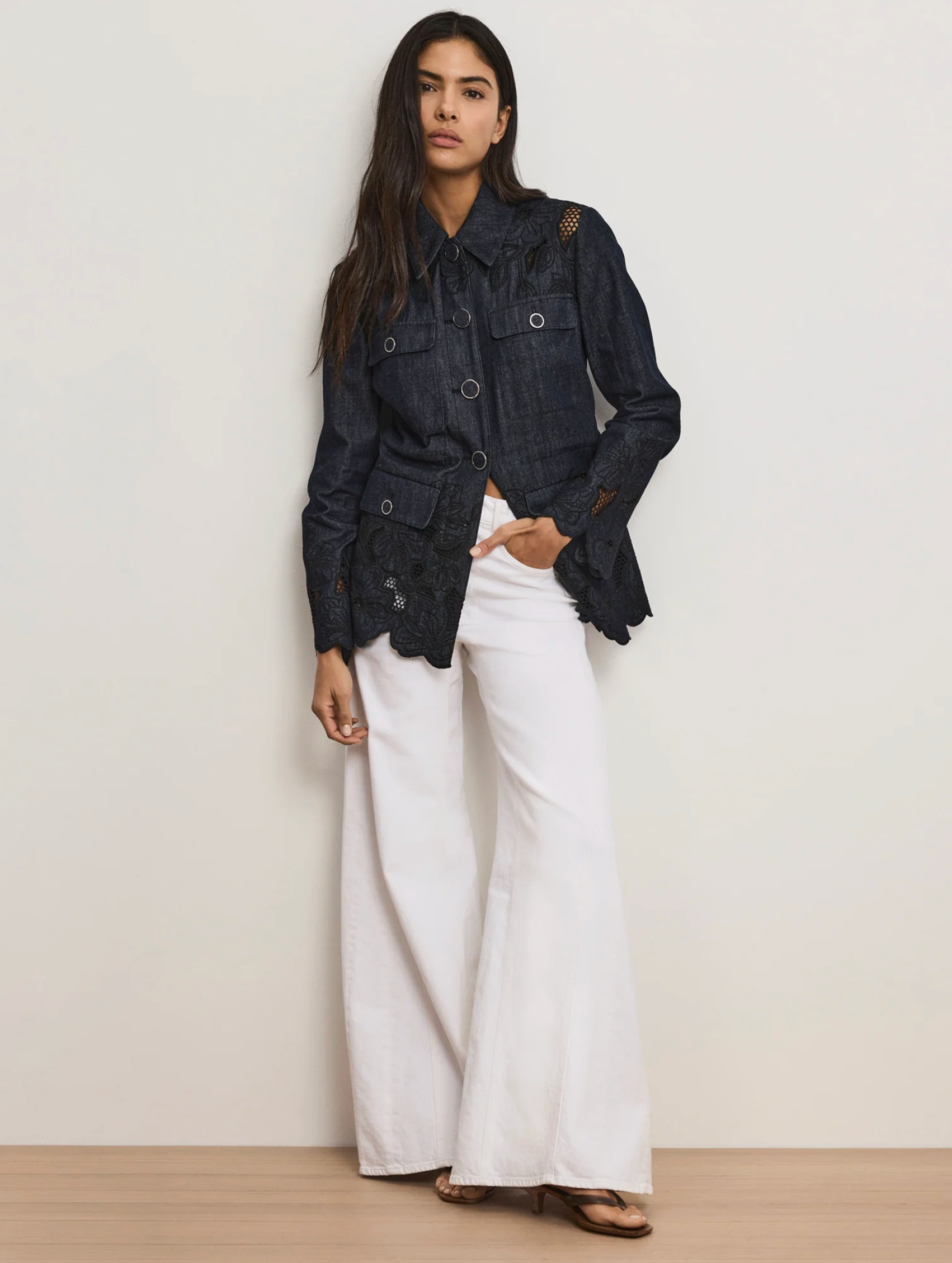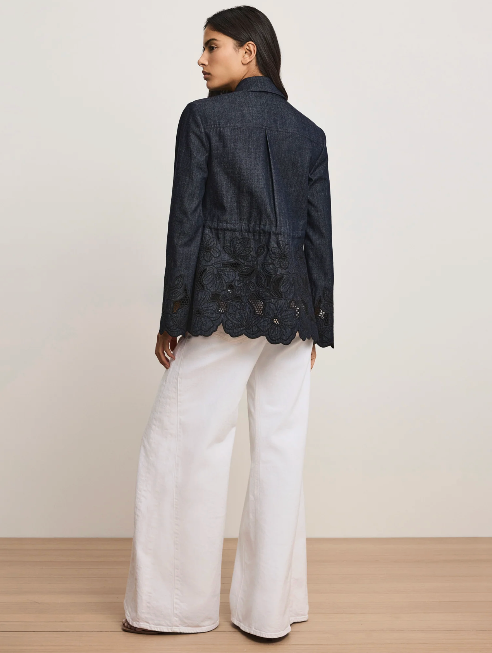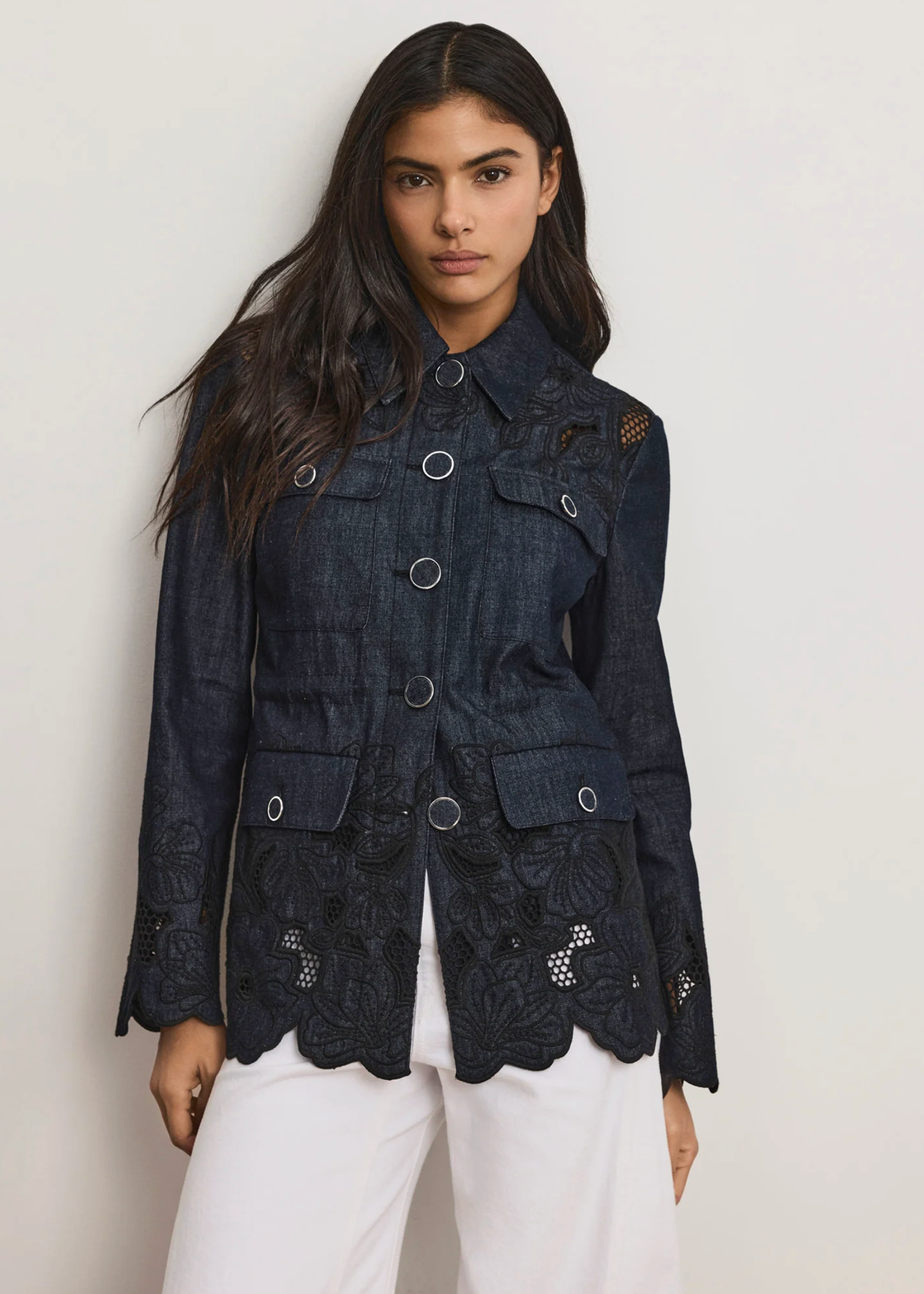 A romantic take on the classic field jacket, the Kiki is expertly tailored from premium cotton chambray. Its elongated silhouette features feminine details, including floral eyelets accented with contrast embroidery, while an adjustable bungee waist provides a cinching effect. A sharp point collar, chest pockets, and oversized hip pockets add a utilitarian touch.