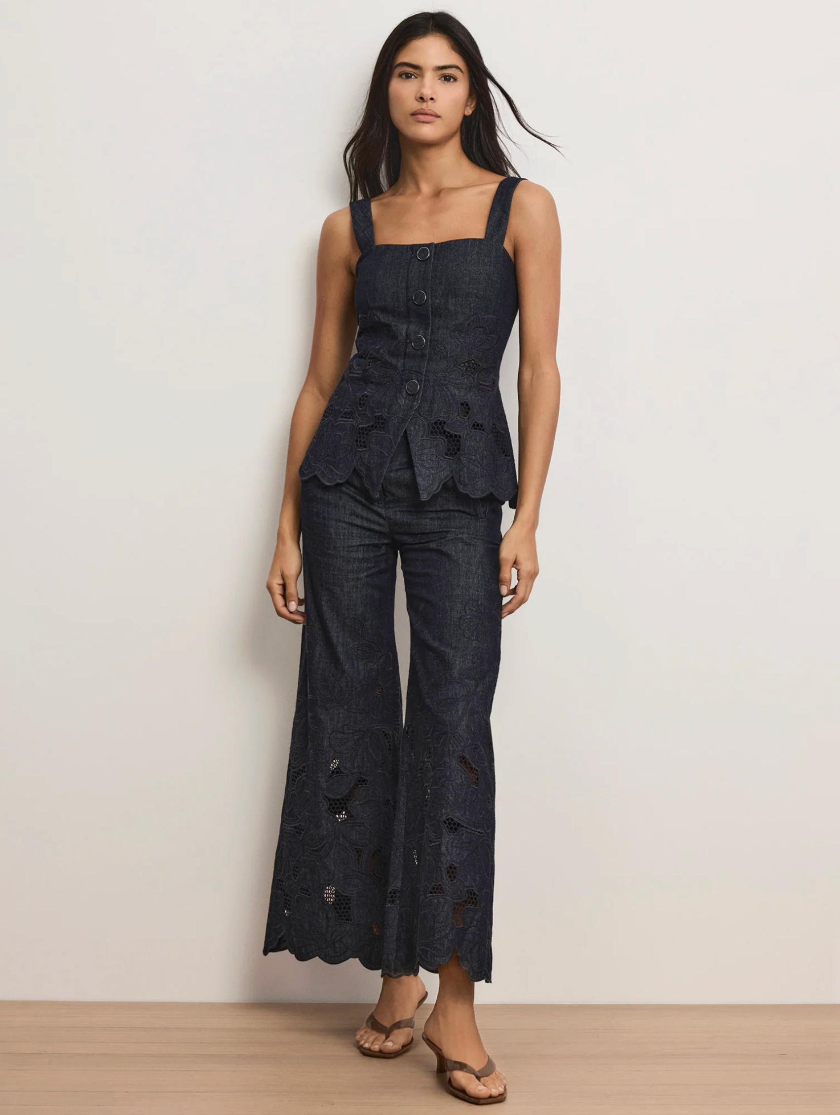 Expertly tailored from premium cotton chambray, the Mirielle top features eyelet panels and a feminine petal-scalloped hem. Designed with a square neckline and adjustable straps, it’s finished with decorative self-covered buttons down the front, a split hem, and a back zipper for easy on-and-off wear. Perfect for elevating the everyday, pair this navy top with VB denim or the matching Osborne pant for a chic, coordinated set.