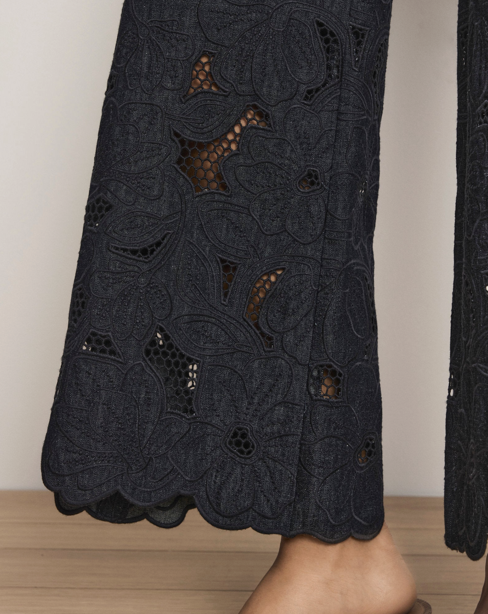Expertly crafted from premium cotton chambray, the Osborne eyelet pant is defined by intricate floral eyelet embroidery. Designed with a Hollywood waist and double darting, its wide-leg silhouette is exceptionally flattering. Slip pockets and back welt pockets add functionality, while a scalloped hem provides a feminine finish. Pair with the matching Mirielle top for a fresh take on set dressing.