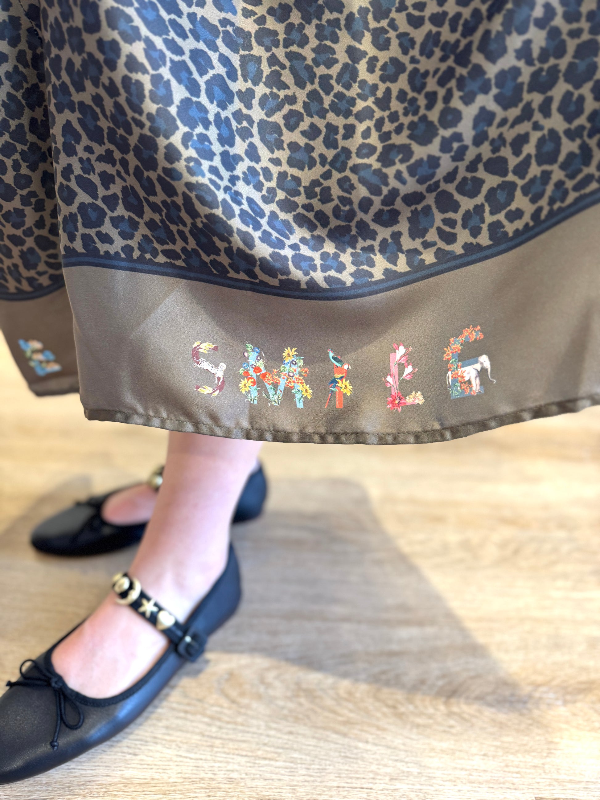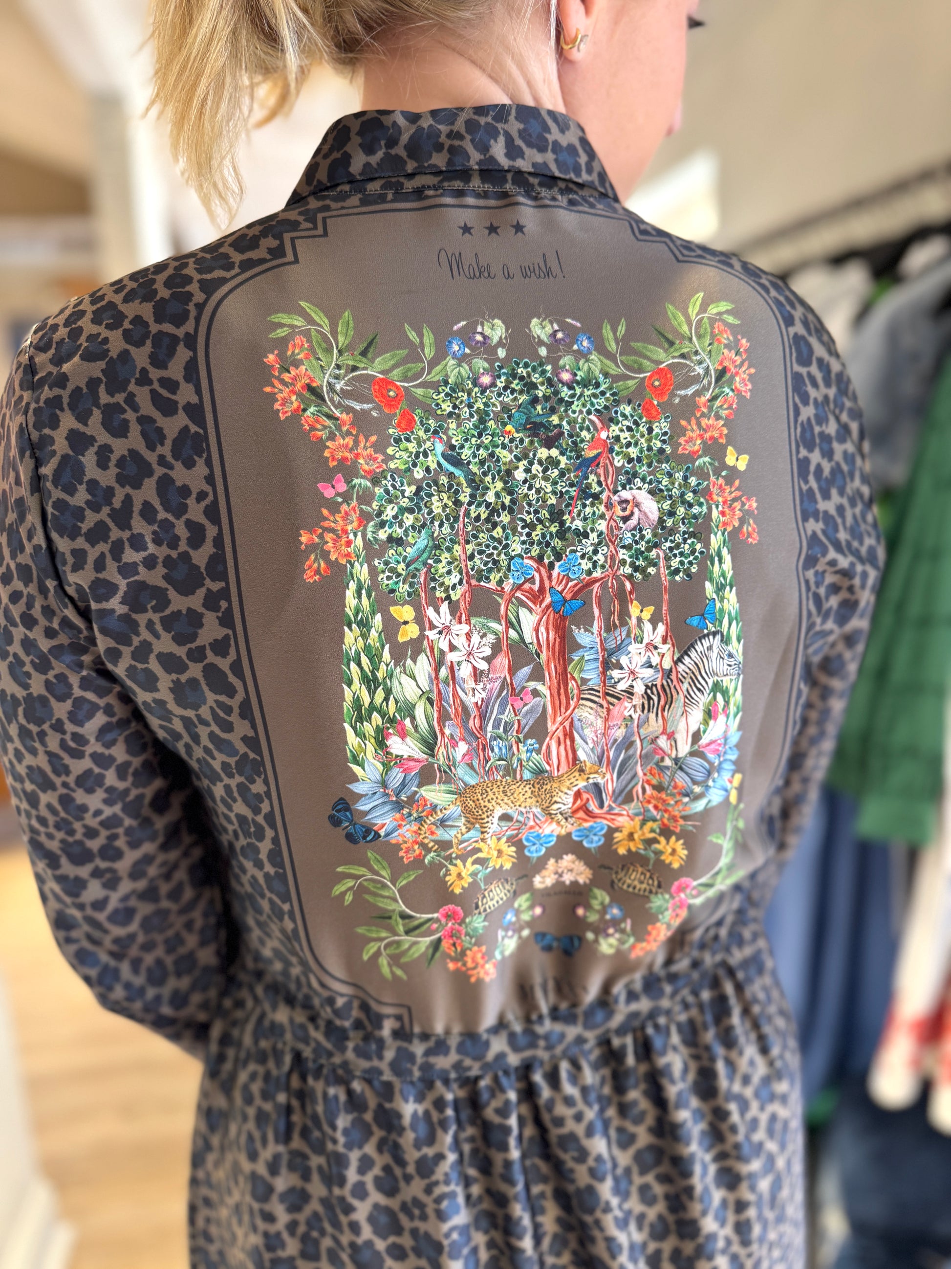 This long leopard print dress showcases a vivid jungle scene on the back, rendered in striking colors. It offers a straight silhouette with subtle gathered detailing at the hem for added volume. With a subtle reminder to keep smiling around the hem.