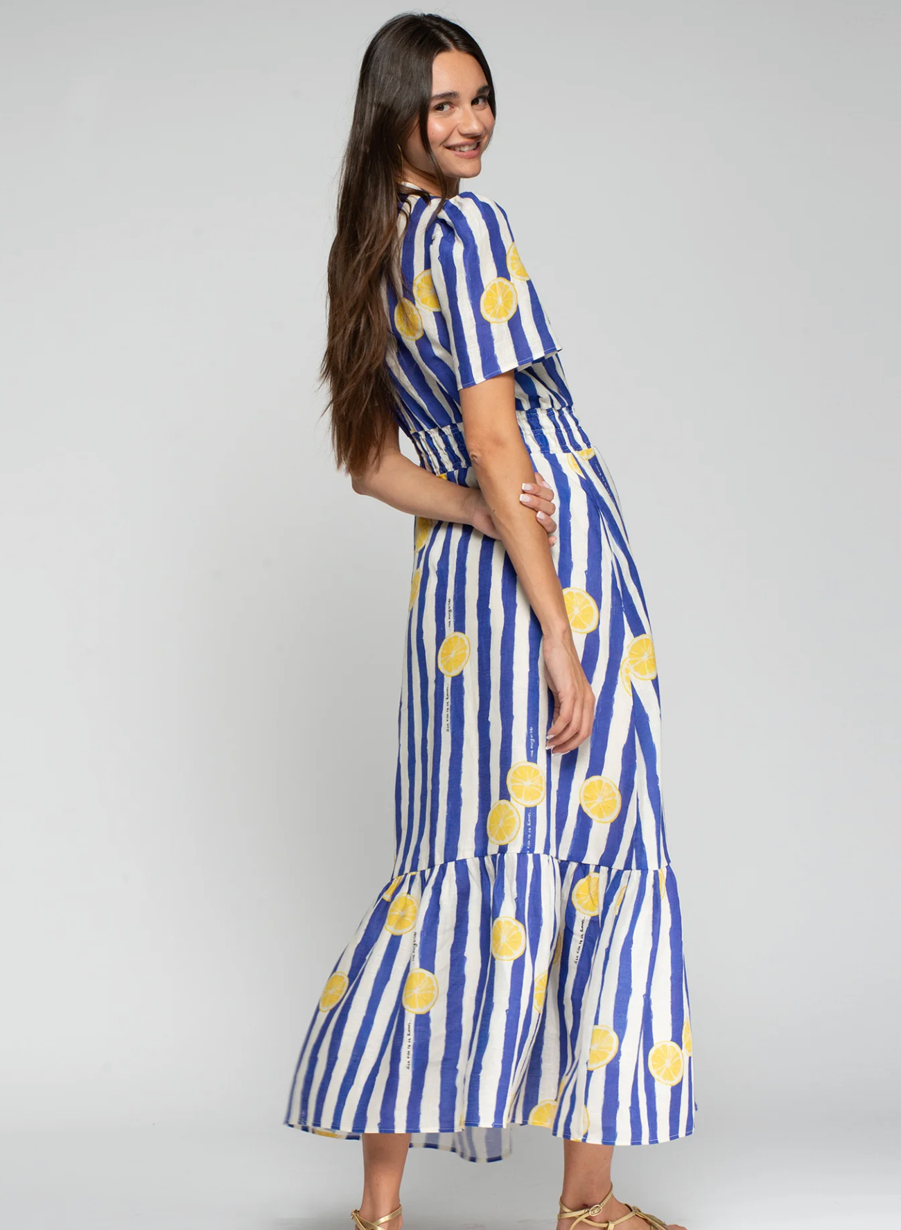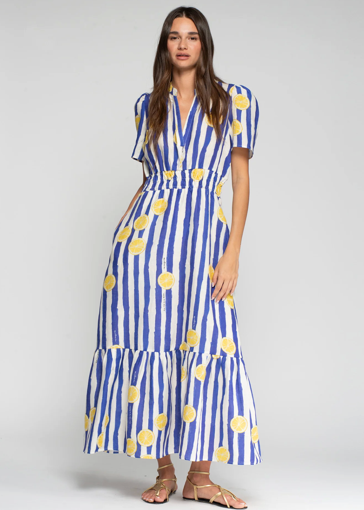 Long blue and white striped dress with a lemon print. V-neck, short sleeves, and a gathered waist. Ruffled hem.
