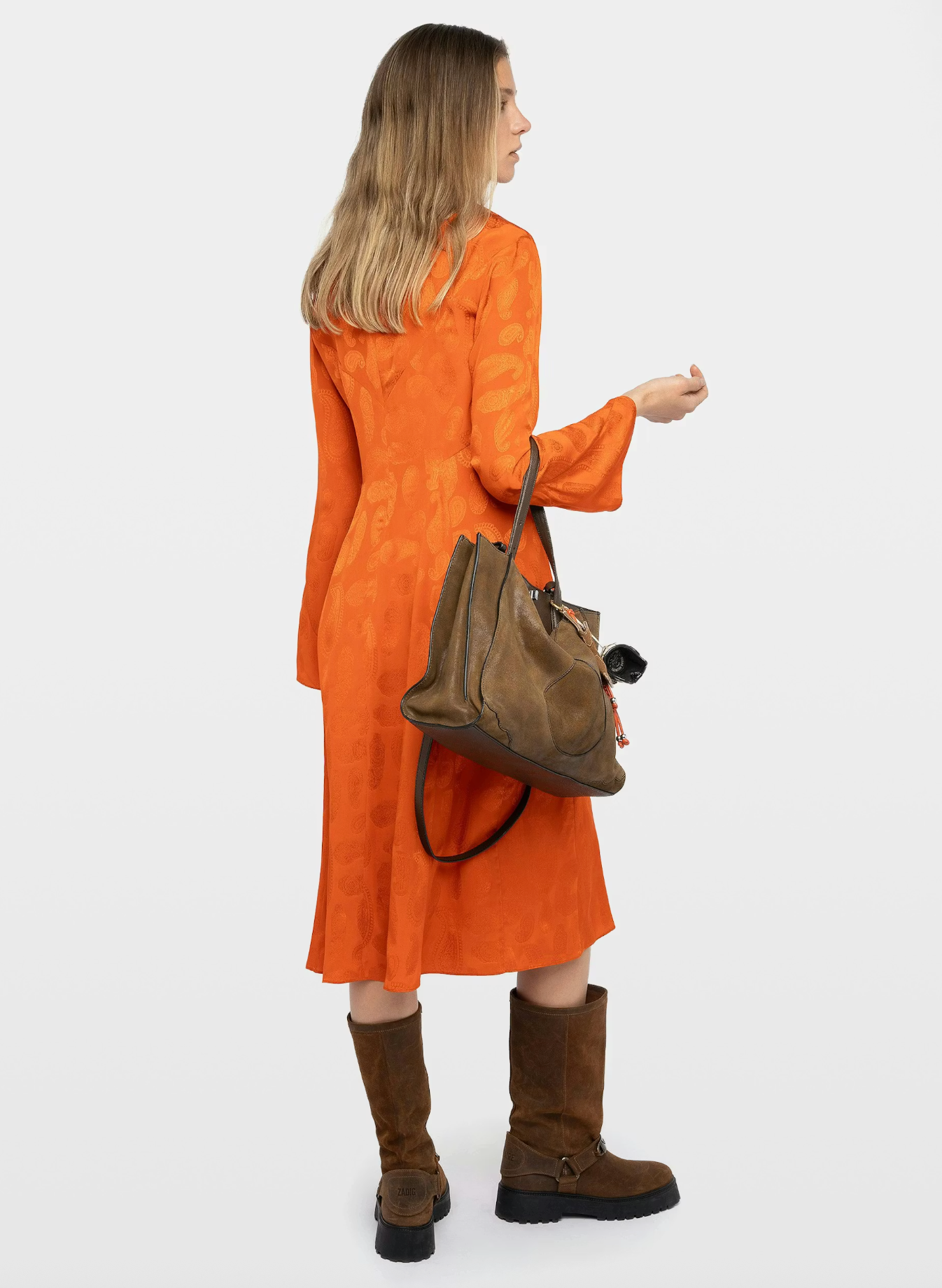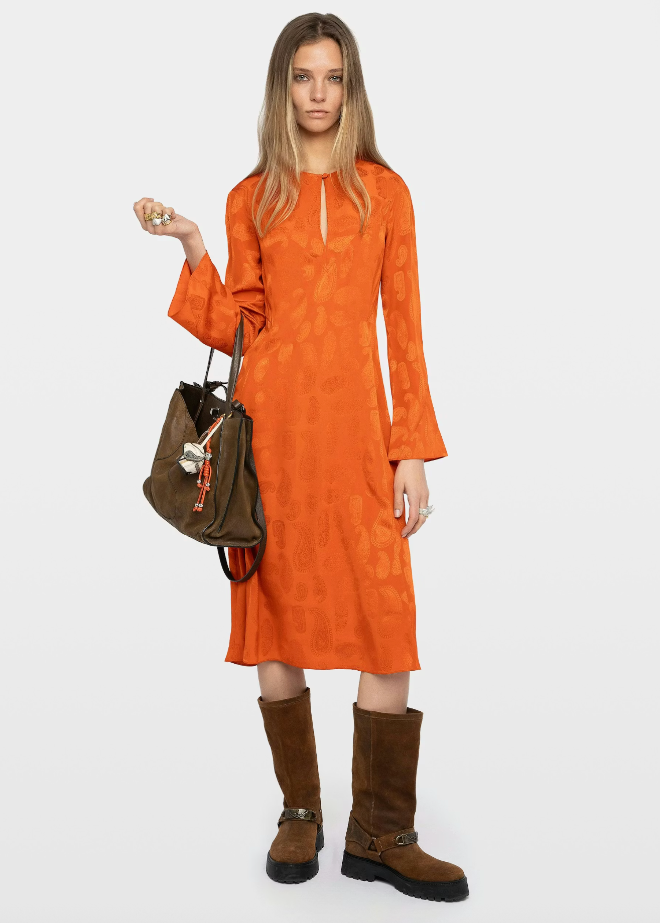 Slip into pure silk luxury with this stunning paisley jacquard dress. The deep neckline and dramatic bell sleeves create an effortlessly chic silhouette that demands attention. Crafted from 100% silk, this piece drapes beautifully and feels as good as it looks. Perfect for elevating any outfit with a touch of bohemian flair and timeless elegance.